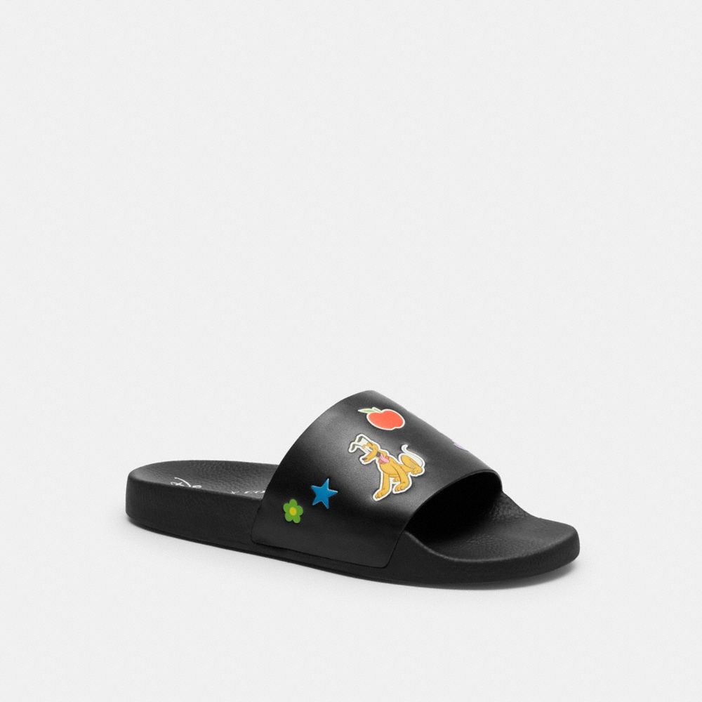 Beloved Disney characters meet iconic Coach design in this special collection starring the one-and-only Mickey Mouse and friends. Our laidback, sporty leather slide features Mickey and pals in a playful, colorful sticker print inspired by nostalgic notebook decals. It’s finished with a contoured footbed and rubber sole for all-day comfort.